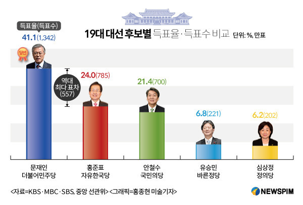 19대 대통령 선서 결과를 보면 문재인은 41.1% 득표로 낮은 득표율을 보였다. 박근혜 탄핵 정국에서 상대적으로 지지율이 높았던 문재인의 예상치 못한 득표율이었다.